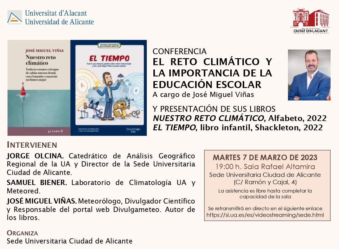 Con motivo de la publicación de los libros “Nuestro reto Climático” (Alfabeto, 2022) y “El tiempo” (libro infantil, nº 1 de la colección Ciencia perruna y curiosidad gatuna. Shackleton Kids, 2022), José Miguel Viñas impartió la conferencia titulada: El reto climático y la importancia de la educación escolar en la Sala Rafael Altamira de la Sede Universitaria Ciudad de Alicante, la tarde del martes 7 de marzo de 2023. Le acompañaron en el acto Jorge Olcina, catedrático de Análisis Geográfico Regional de la Universidad de Alicante (UA) y Director de la citada Sede Universitaria, y Samuel Biener, del Laboratorio de Climatología de la UA y Meteored.