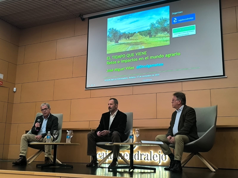El jueves 27 de noviembre de 2025 José Miguel Viñas impartió una conferencia titulada El tiempo que viene. Retos e impactos en el mundo agrario, en el marco de una Jornada dirigida al sector agrario, organizada por la Dirección General de Sostenibilidad de la Consejería de Agricultura, Ganadería y Desarrollo Sostenible, y por Cajalmendralejo, que tuvo lugar en la sede central de la entidad bancaria, en Badajoz.