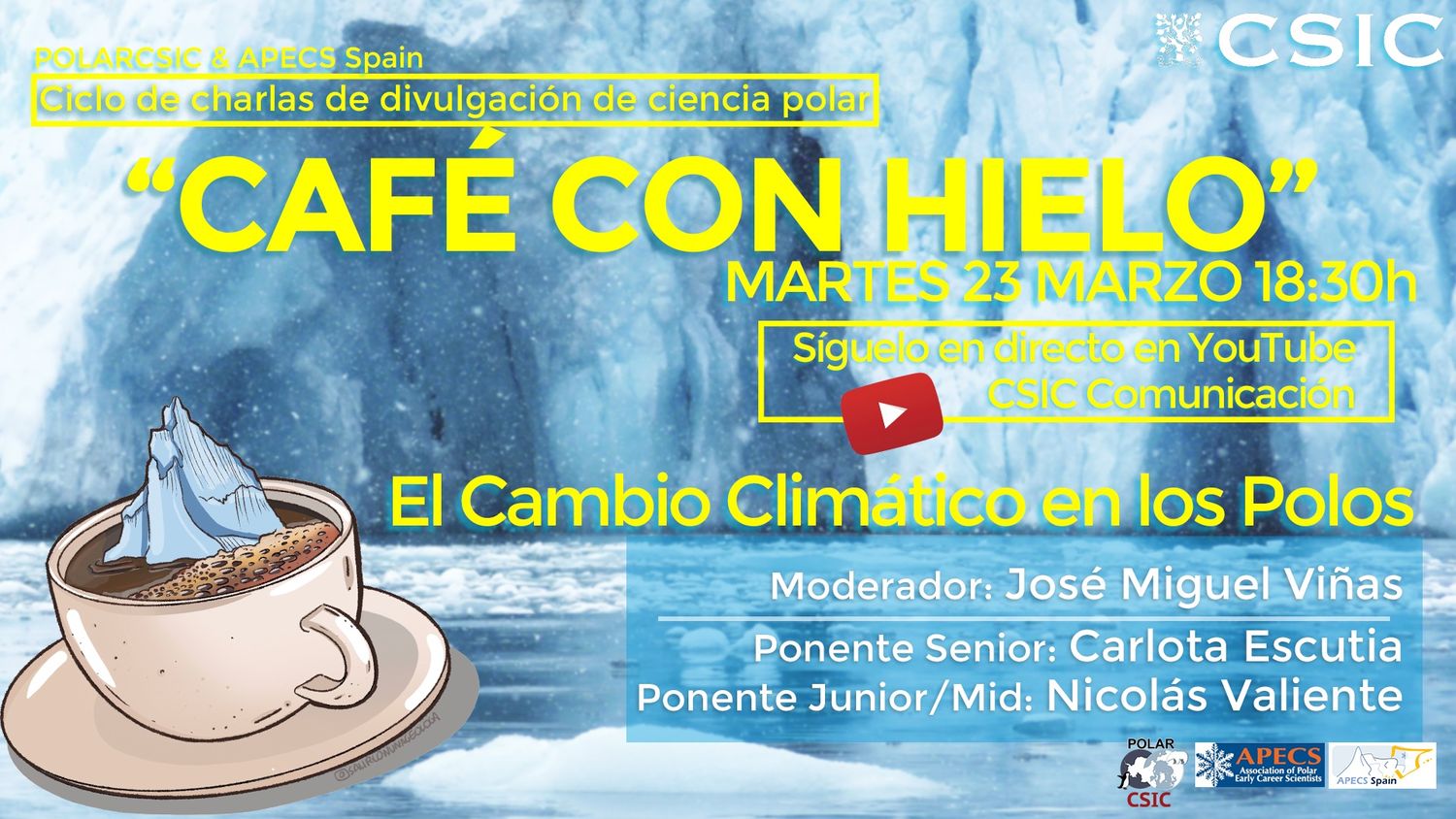 El primer seminario virtual del ciclo de charlas de divulgación de la ciencia polar “Café con hielo”, organizado por la plataforma PolarCSIC, del Consejo Superior de Investigaciones científicas, y la Asociación Española de Jóvenes Investigadores Polares (APECS España), celebrado a través del canal de YouTube del CSIC el 23 de marzo de 2021, llevó por título “El cambio climático en los polos”, fue moderado por José Miguel Viñas y contó con la participación de los investigadores polares Carlota Escutia y Nicolás Valiente.
